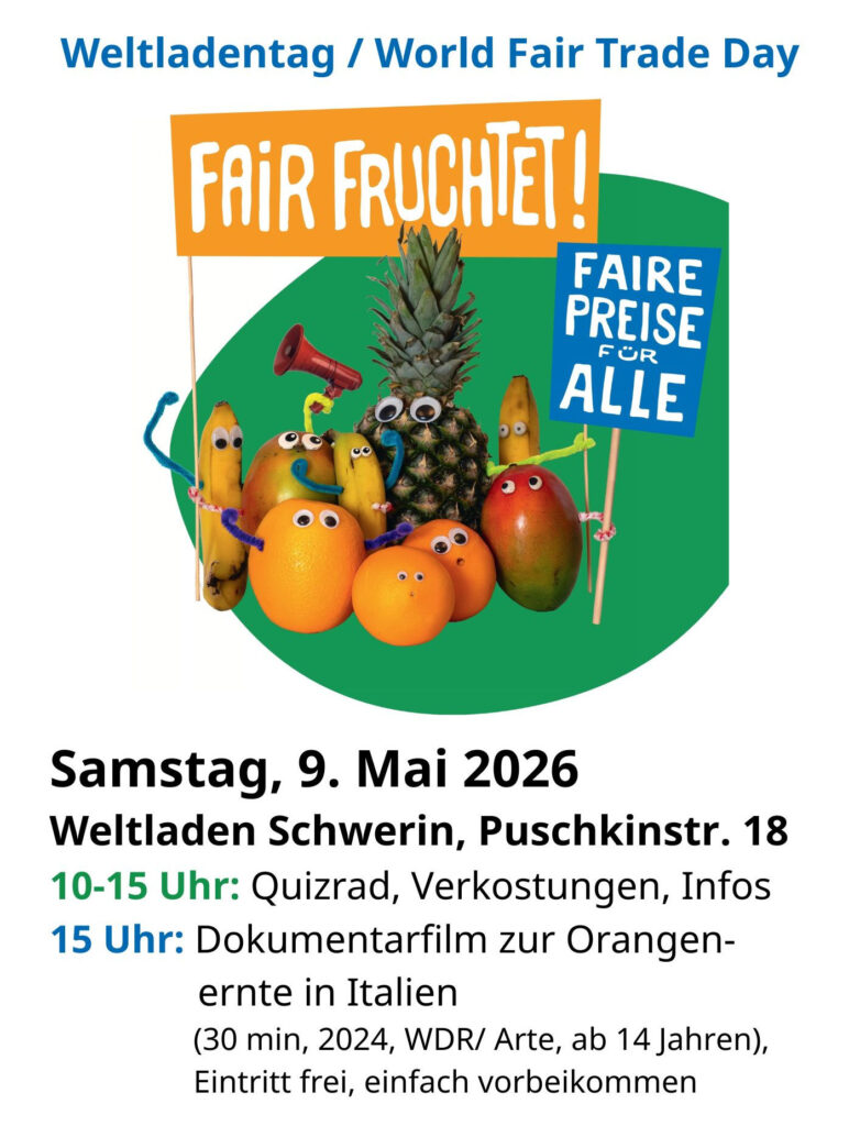 Mit dem Verkauf von Waren aus partnerschaftlichem Handel mit Ländern des globalen Südens machen wir – der gemeinnützige Verein Aktionsgruppe Eine Welt e.V. Schwerin – seit 1991 auf ungerechte Welthandelsstrukturen aufmerksam und schaffen gleichzeitig eine Alternative zu herkömmlichen Handelspraktiken. Wir führen Bildungsaktivitäten zu globaler Gerechtigkeit durch und setzen uns durch die Beteiligung an politischen Kampagnen für bessere Rahmenbedingungen für die Menschen im globalen Süden ein. Mehr über uns hier: Über uns