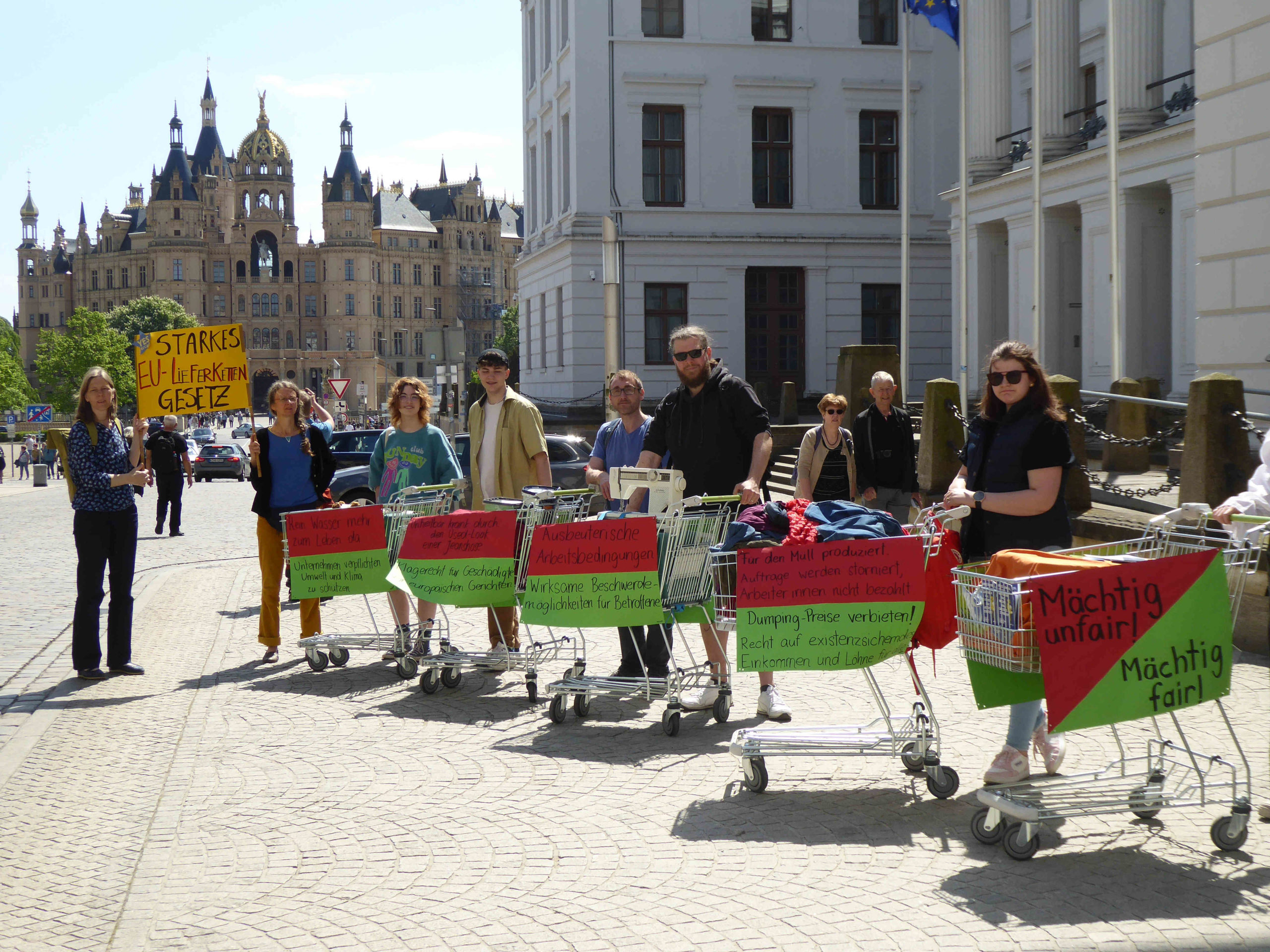 Mit einer Einkaufswagen-Ausstellung, riesigen Zeitungen und einem kreativen Demonstrationszug forderten wir, die Aktionsgruppe Eine Welt e.V. Schwerin / Weltladen Schwerin zusammen mit der Amnesty Jugend Schwerin und Schülerinnen des Schullweltladens am Fridericianum Schwerin am Sa., 13.5.2023, dass globale Lieferketten durch ein starkes EU-Lieferkettengesetz gerechter werden müssen. Ullis Super Natur Markt Schwerin unterstützte uns mit Einkaufswagen.